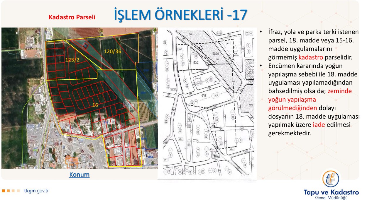 Tapu ve Kadastro Genel Müdürlüğü (TKGM) tarafından paylaşılan slaytta, İmar Kanunu?nun 15 ve 16 ncı maddeleri uygulanarak oluşmuş imar parsellerinin yeniden ifraz, tevhit, yola terk ve yoldan ihdas gibi imar uygulamalarına konu edilmesi halinde teknik rapor hazırlanmasına gerek bulunmadığı belirtilmiştir.