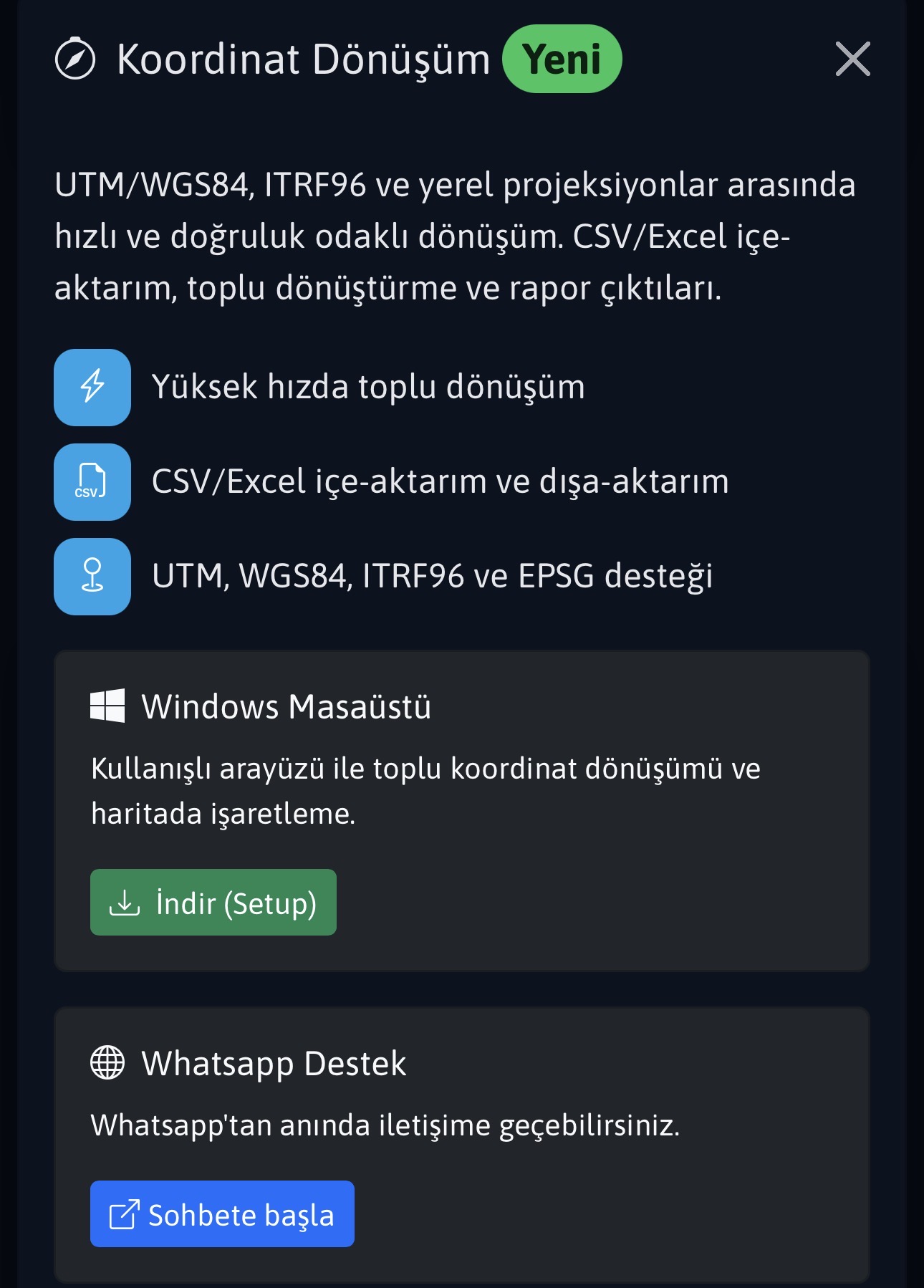 Tarafımca yazılan bu Program ile WGS 84 Coğrafi Koordinatlardan Otomatik olarak D.O.M (Dilim Orta Meridyen) Hesabı yaparak UTM 3 Derecelik ITRF96 Koordinatlarına ve ITRF96 Koordinatlarından WGS 84 Koordinatlarına çevirerek çıkan sonuçları Harita üzerinde İstatiksel olarak görebilir,işaretleyebilir ve işaretlediğiniz koordinatları yine Excell ve KML formatında çıktı olarak kaydedebilir,Hacim Hesabı yapabilir,NCN dosyalarınızı okuyup çıktı alabilirsiniz,CAD olarak düzenleyebilirsiniz.